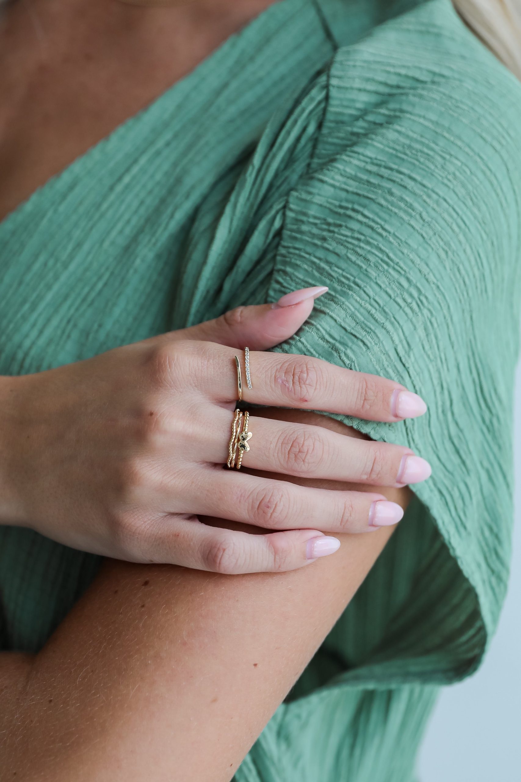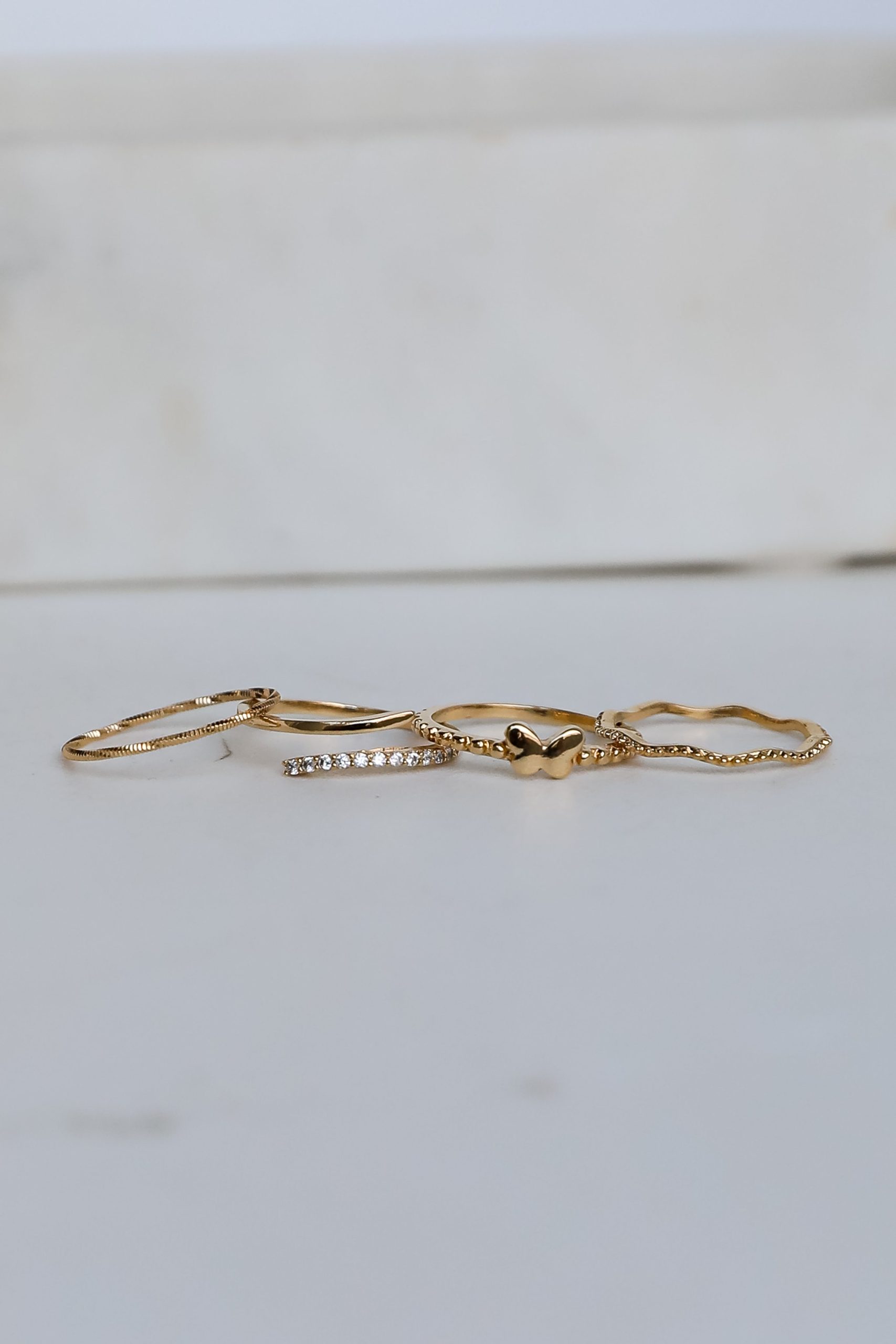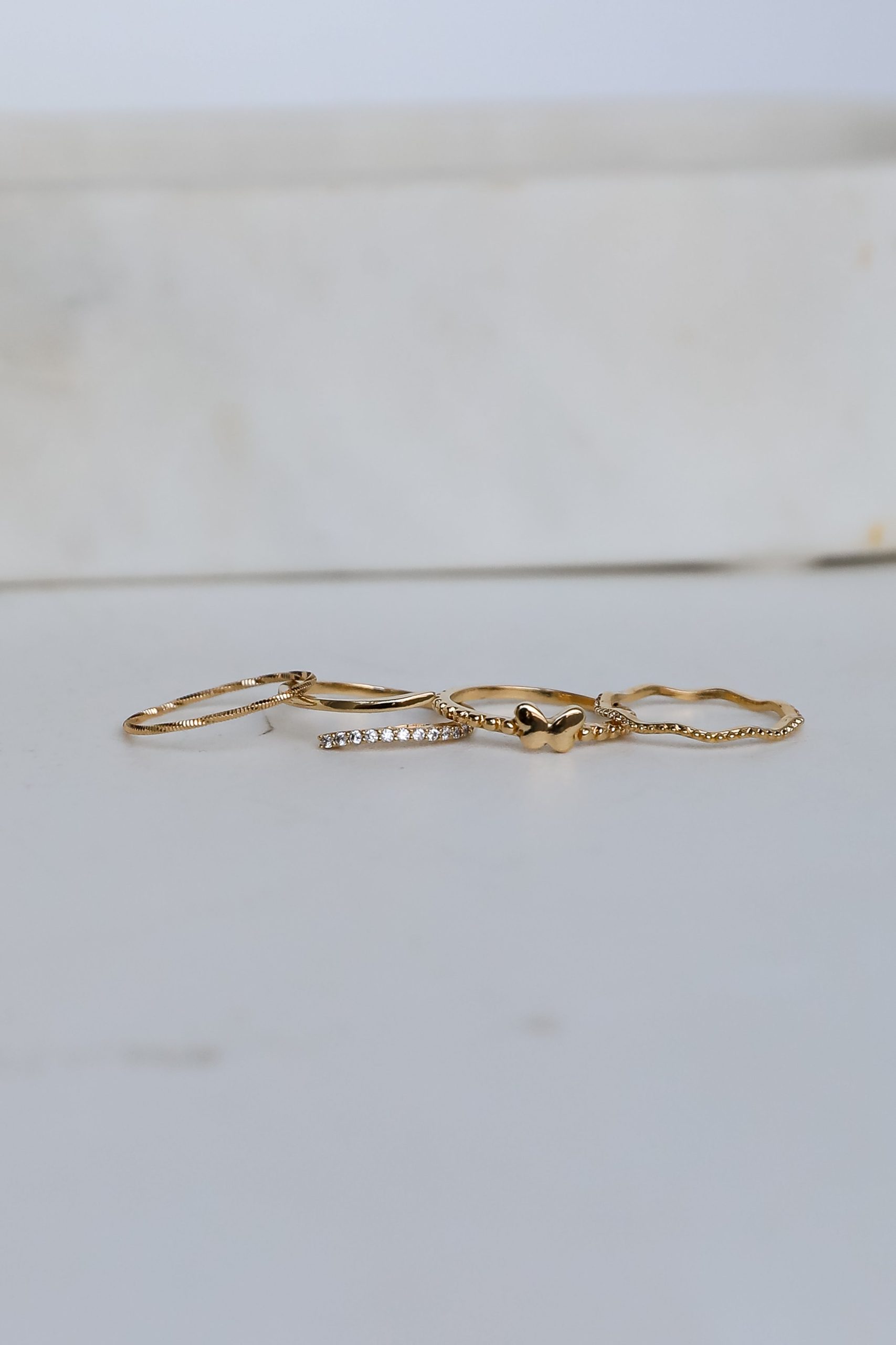 Everyone will be looking to you for style inspo with the Elena Gold Ring Set! This set of four dainty gold rings feature varying shapes and textures including a butterfly + rhinestones. Wear the Elena Rings separately or stack them all together, either way you’ll love them! Gold Plated Set of 4 Butterfly RhinestonesRing Sizes Vary 5 – 6
